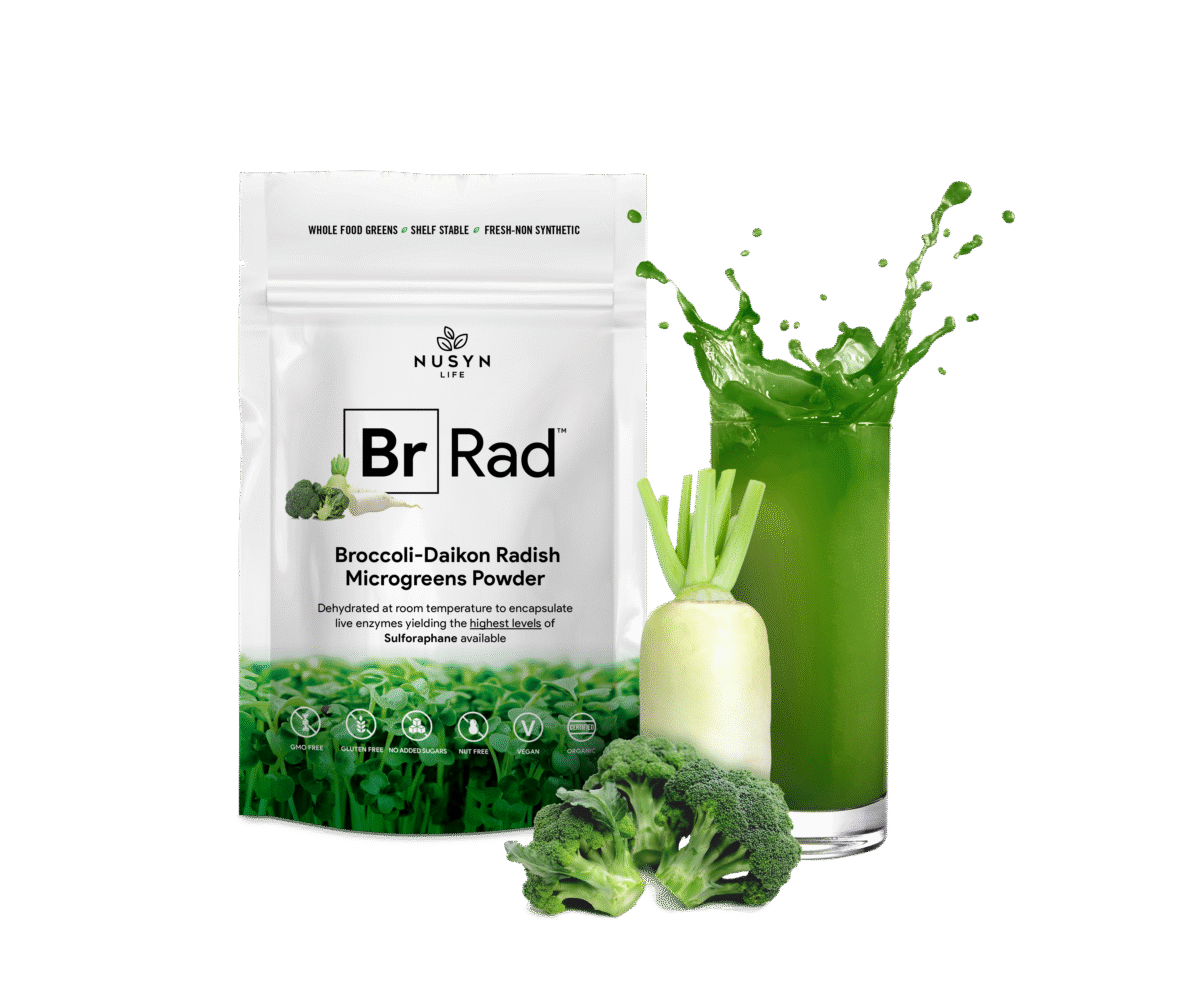 BrRad is simply fresh Micro-Green Broccoli and Radish in it’s highest concentration. Grown in 100% Organic Material the source Micro-Greens are then harvested and air dried to keep all nutritional values intact.  Live enzymes are the reason this product has the highest levels of Sulforaphane (SFN) available.